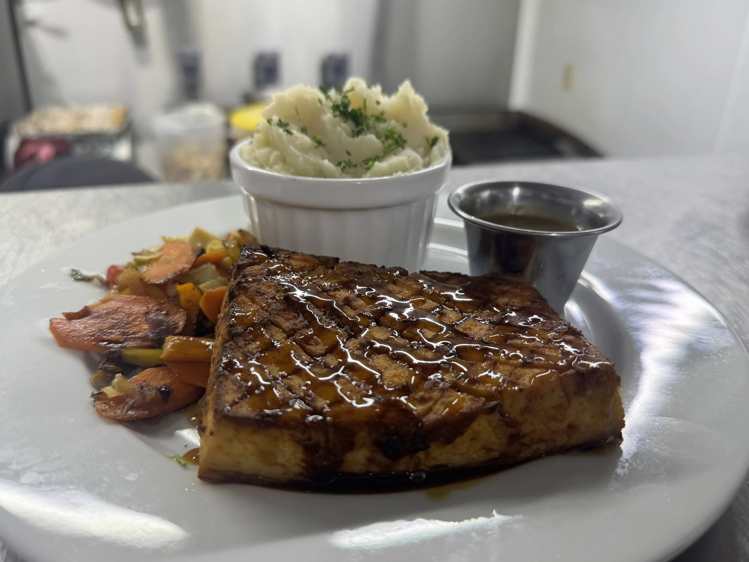 (V)- beautiful seitan steaks caramelized in a marinade served garlic mashed potatoes & asparagus.