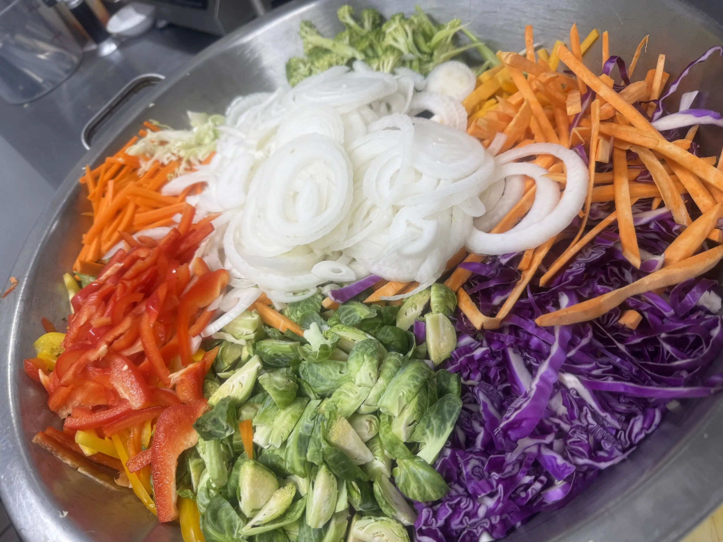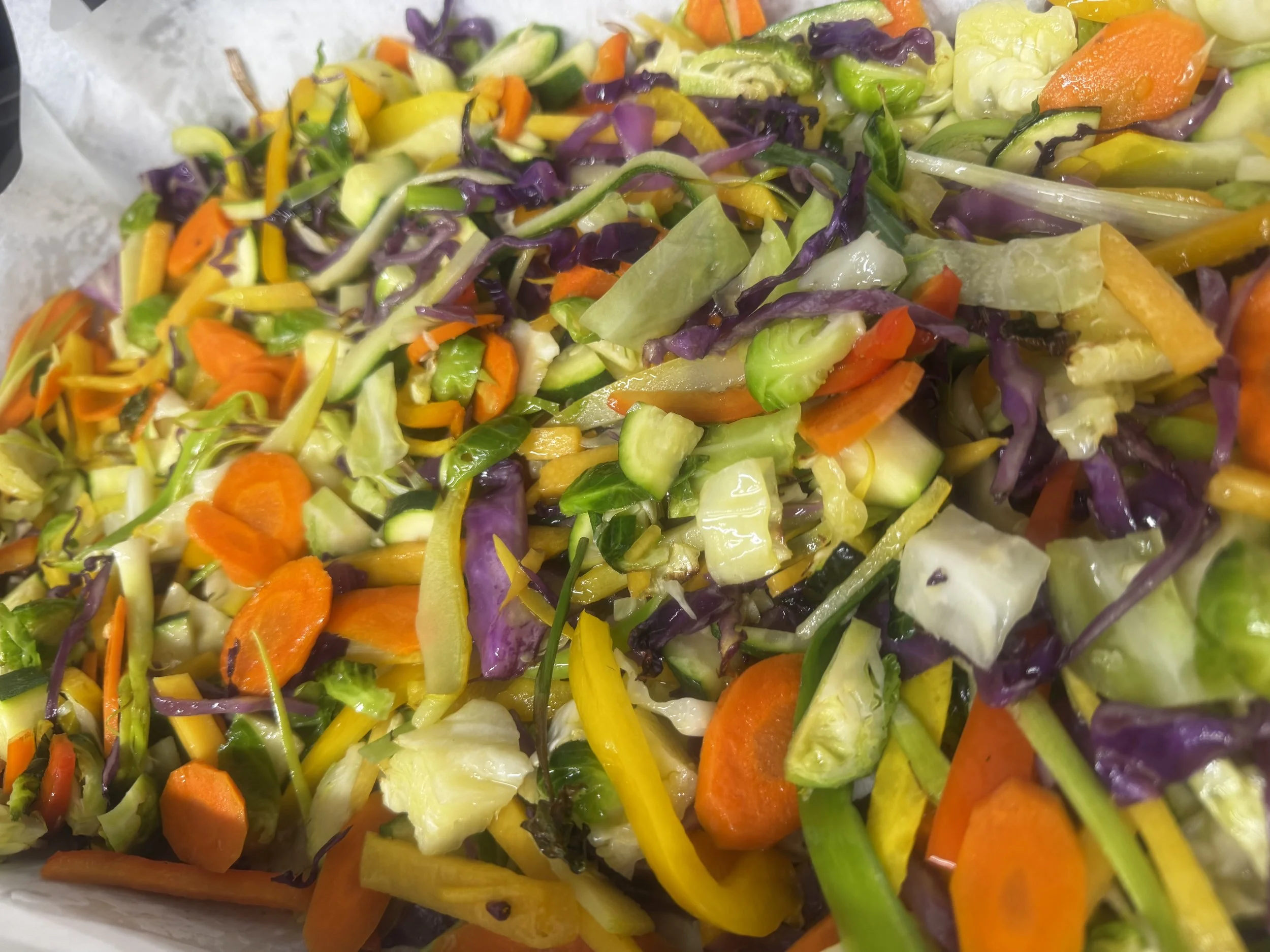 (V)-caribbean seasoned tofu served with black beans & rice, roasted zucchini, broccoli, pineapple, onions, & sweet peppers.