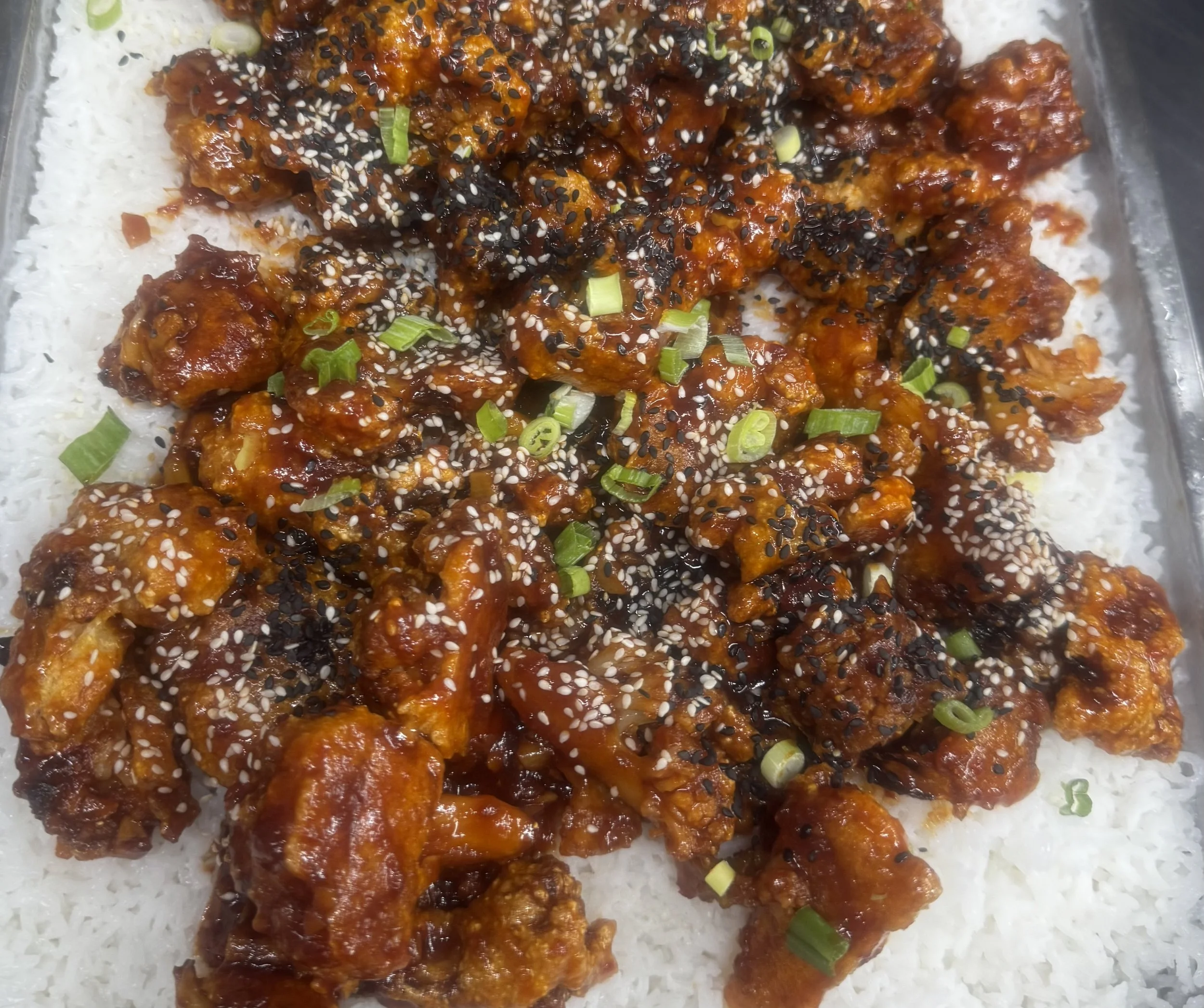 served on a bed of rice. (V) - Crispy cauliflower tossed in a sweet and spicy sauce.